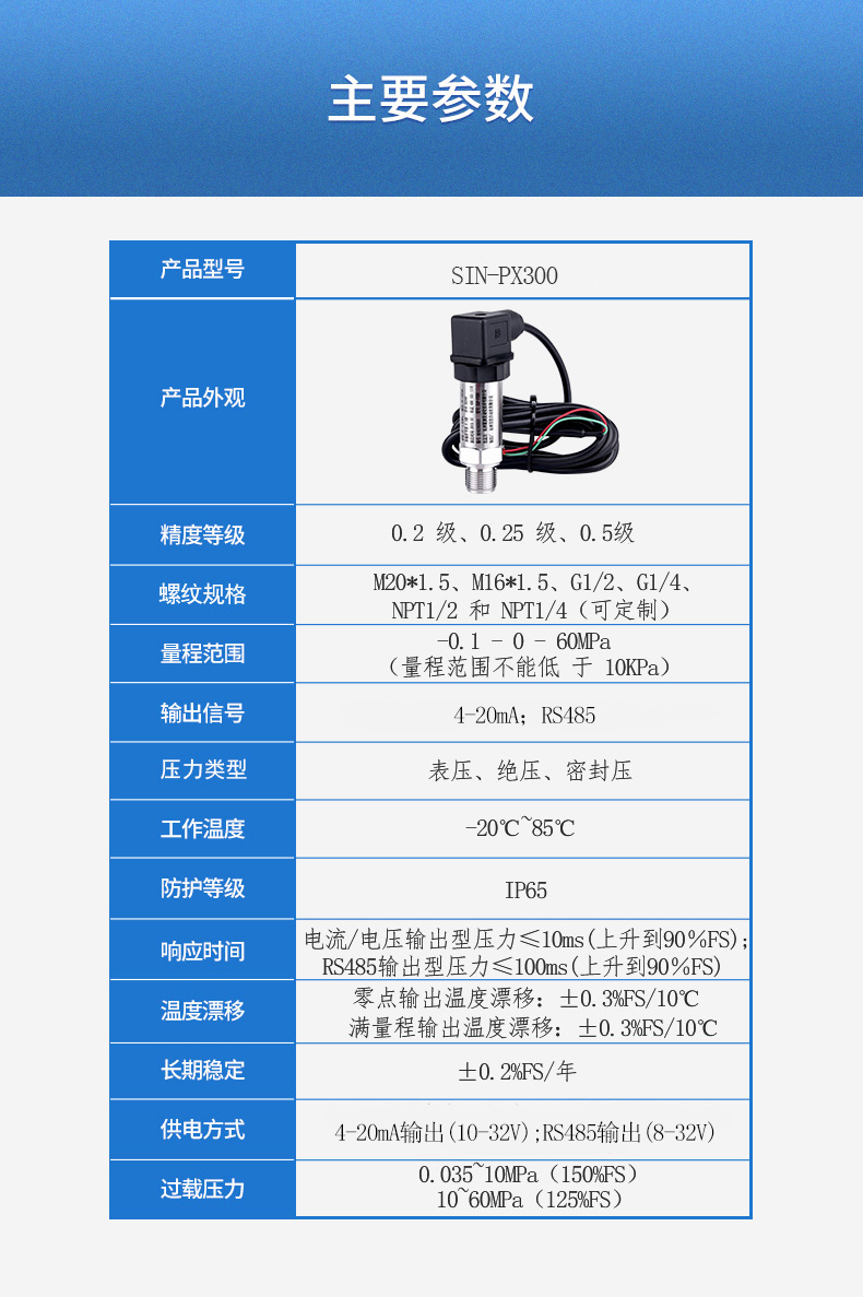 SIN-PX300型數顯壓力變送器采用無縫焊接結構,可批量化生產,經濟、可靠,具有良好的適應性,可應用于各種復雜的環境,該產品輸出形式多樣,壓力接口可提供定制,滿足您的使用需求。同時數顯壓力變送器帶有現場顯示功能,能夠更加直觀的顯示現場的壓力波動情況。廣泛應用于工業自動化設備配套以及石油、化工、冶金、電力等控制領域。